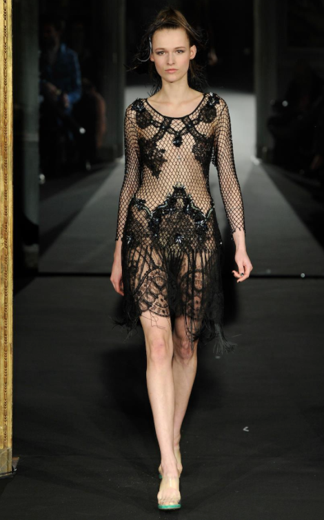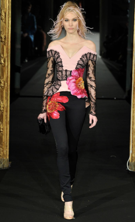 Profondamente radicata nel suo esser “femmina”, la donna di questa collezione Haute Couture Spring 2015, non tralascia le sue spine, le rende parte della forza del suo carattere ammaliatore e le trasmette con inserti in pelle, in giochi di trasparenze con pizzi e fasce, chiudendosi quindi, per proteggere il proprio cuore avvolto da morbide sete.