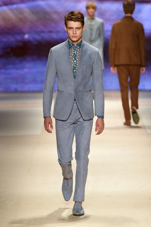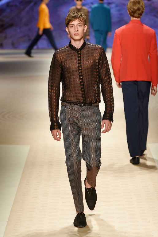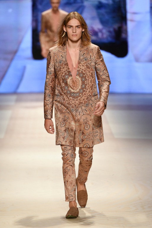 Etro, racconta i colori della pelle, che si traducono nella semplicità di nuances apparentemente monocromo, che rivelano la loro identità attraverso delicate, uniche decorazioni. La palette si muove sinuosa verso le meraviglie del deserto, luogo geografico che si immagina privo di variazioni, ma che, nella sua realtà, offre calde distese di meravigliose alternative pittoriche. Quadri, che nella loro semplicità, prendono vita e movimento dietro a suggestive impressioni; surreali luoghi alla Dalì dove rivive l’inconfondibilità dell’uomo Etro. Dita e mani che forgeranno la realtà della moda uomo, costruendo la sua quotidianità dietro a sculture di un’illusoria conformità.